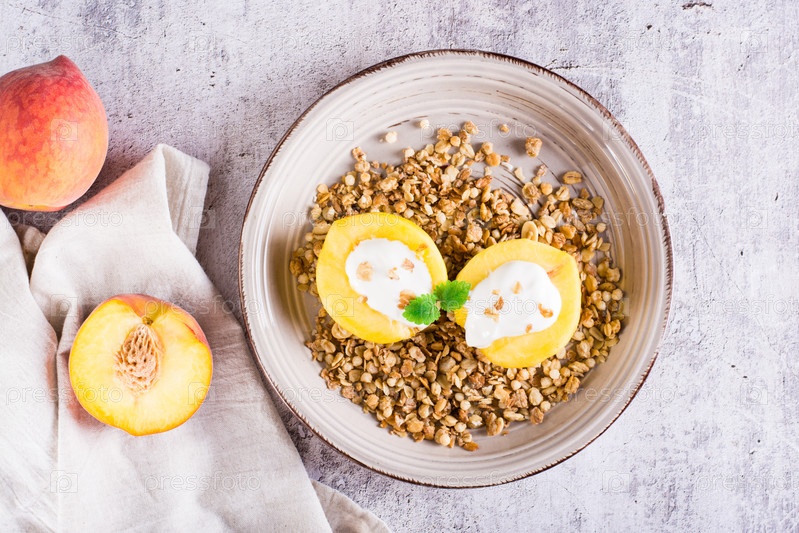 Половинки персика с йогуртом на мюсли на тарелке. Корейский модный греческий момо. Вид сверху
