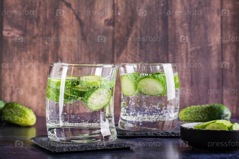Освежающая вода с огурцом в стаканах на столе. Домашние антиоксидантные напитки