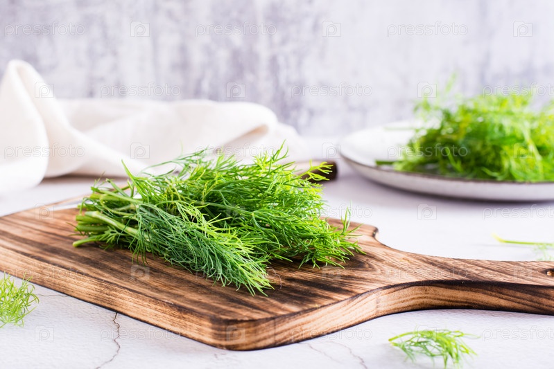 Пучок свежего укропа на разделочной доске на столе. Органическая приправа