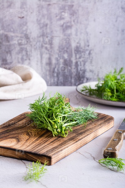 Пучок свежего укропа на разделочной доске на столе. Органическая приправа. Вертикальный вид