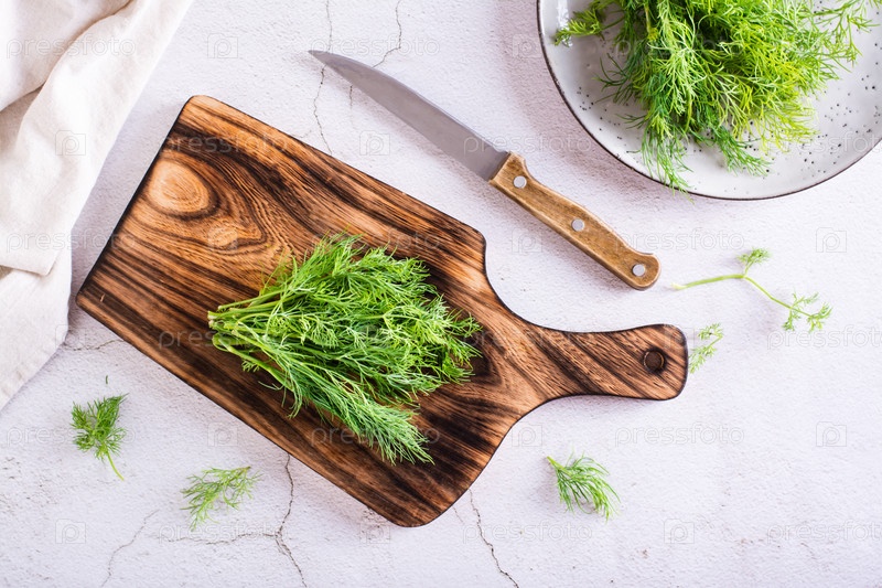 Пучок свежего укропа на разделочной доске на столе. Органическая приправа. Вид сверху