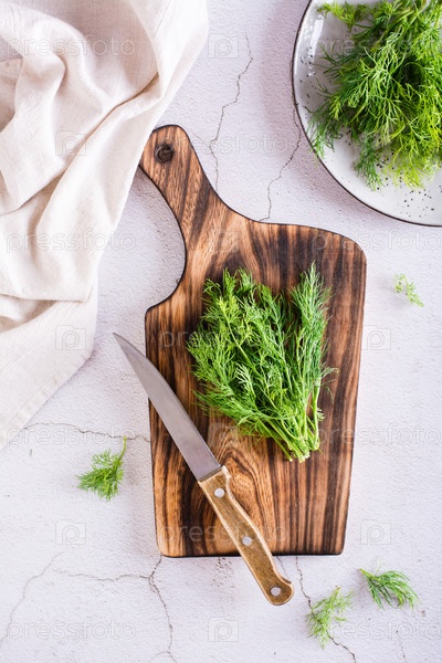 Пучок укропа на разделочной доске на столе. Органическая натуральная приправа. Верхний и вертикальный вид