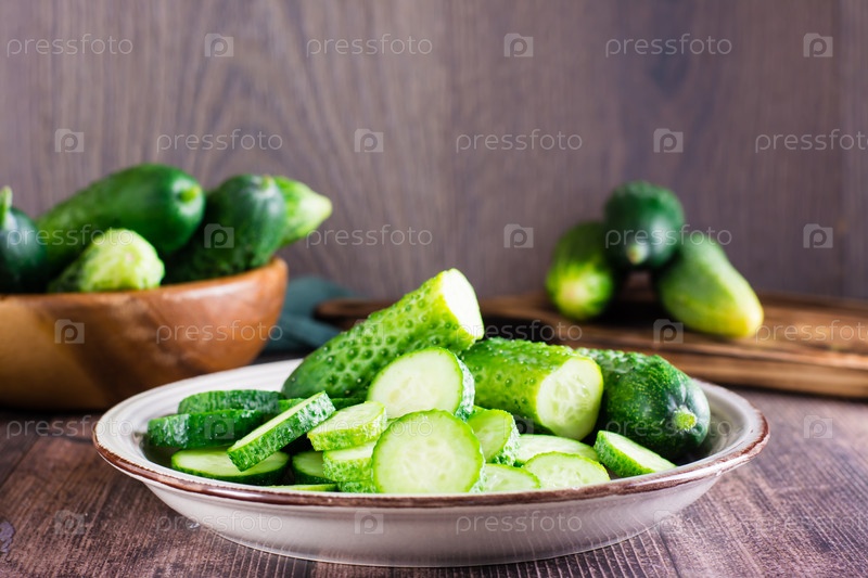 Спелые нарезанные огурцы на тарелке на столе. Органическое диетическое питание