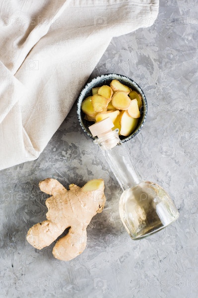 Бутылка с натуральной имбирной сывороткой и нарезанным имбирем. Натуральная косметика для ухода. Верхний и вертикальный вид