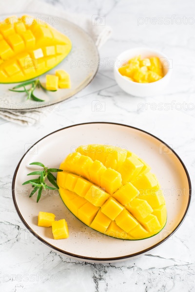 Спелые нарезанные манго на тарелках на столе. Тропический фрукт. Вертикальный вид