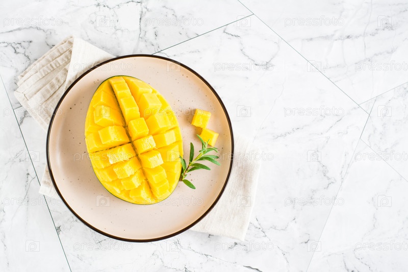 Спелые кубики манго на тарелках на столе. Тропический фрукт. Вид сверху