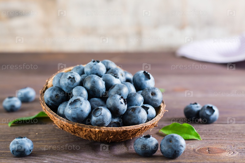 Свежая черника в миске на деревянном столе. Органический дикий суперфуд