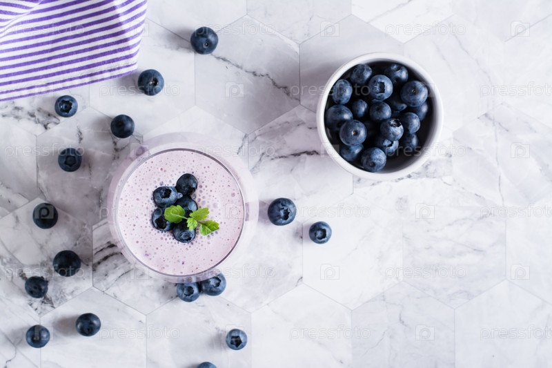 Смузи с черникой и мятой в стакане на столе. Антиоксидантная органическая диетическая пища. Вид сверху