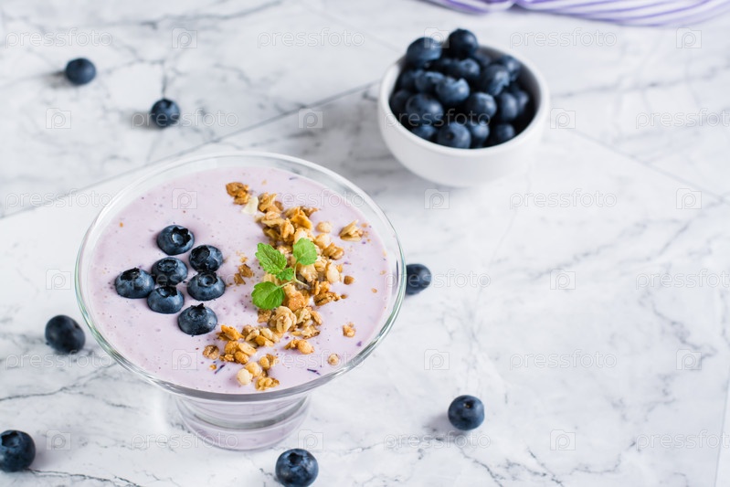 Чаша смузи с черникой и мюсли на столе. Органические антиоксидантные диетические продукты