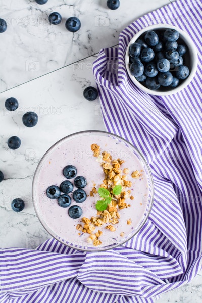 Смузи с черникой и гранолой в миске. Органическая антиоксидантная здоровая пища. Сверху и по вертикали