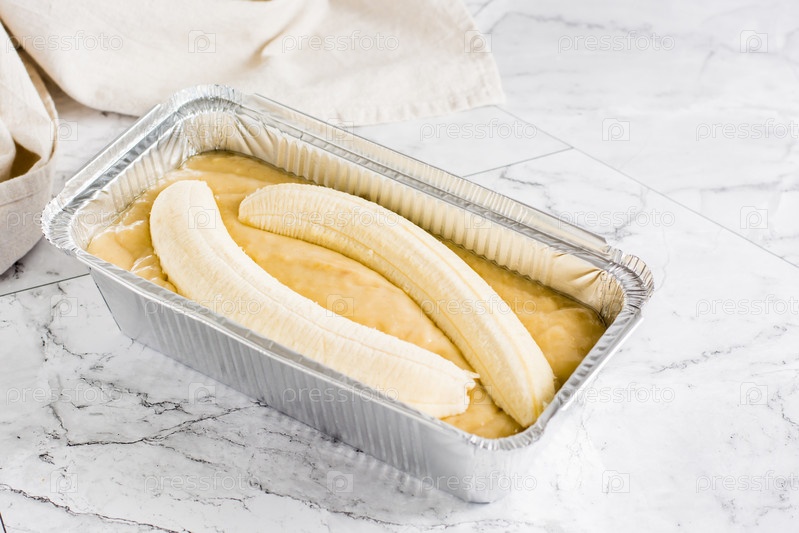 Сырое тесто для бананового хлеба в форме для выпечки на столе. В моде соцсети