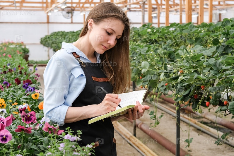 Молодая женщина делает заметки в блокноте, работая в промышленной теплице