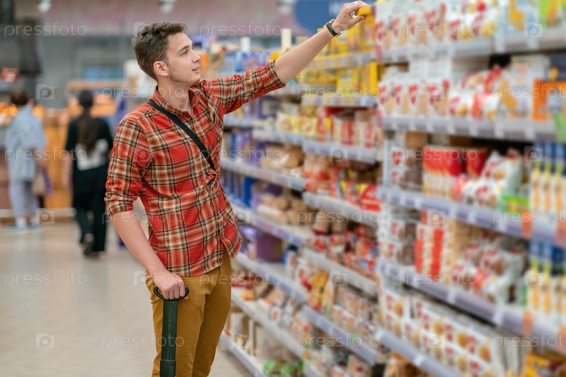 Молодой человек в клетчатой рубашке выбирает товар на полке в супермаркете