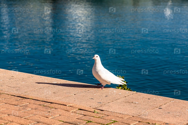 Белый голубь сидит на каменной набережной на фоне голубого моря