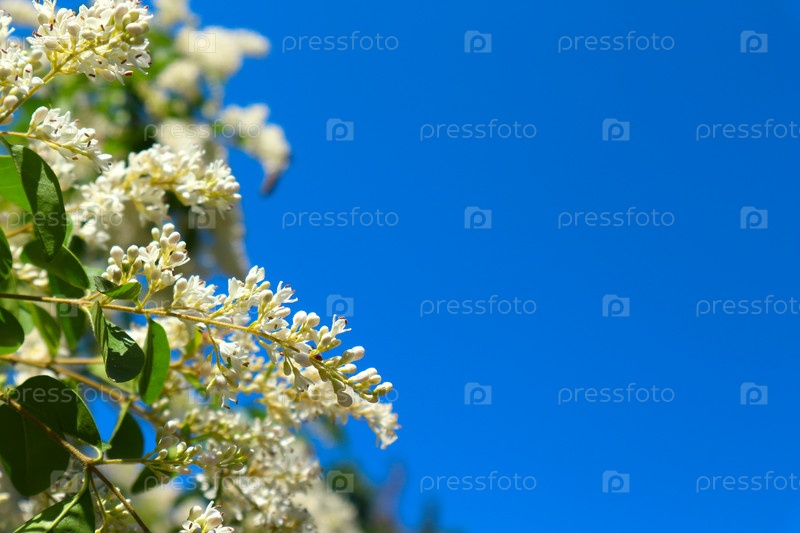 Белая ветка весеннего цветения на фоне ясного голубого неба