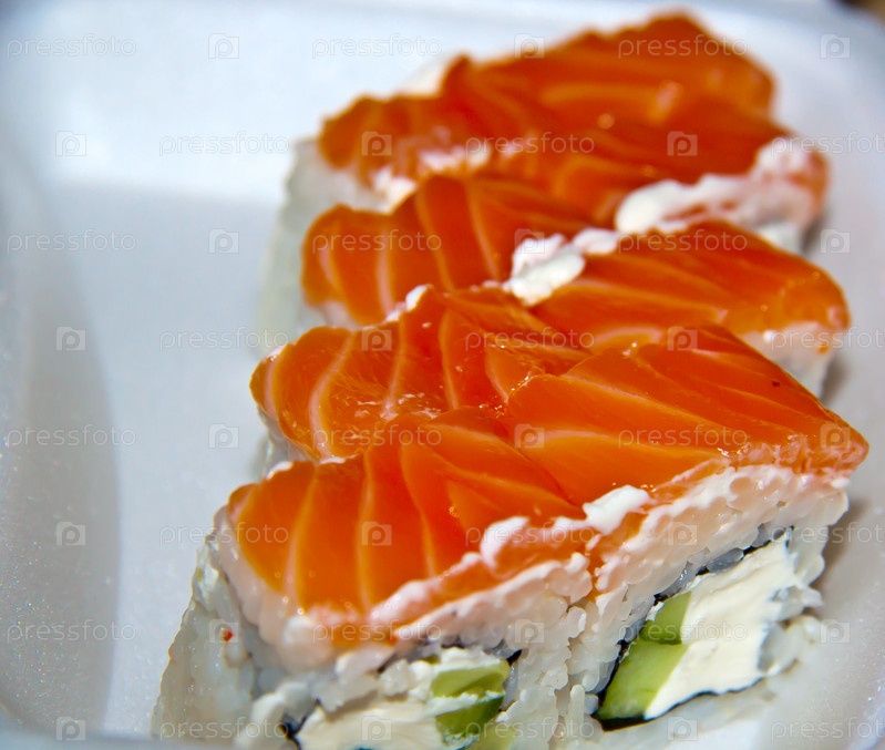 Роллы с красной рыбой крупным планом на белой поверхности
