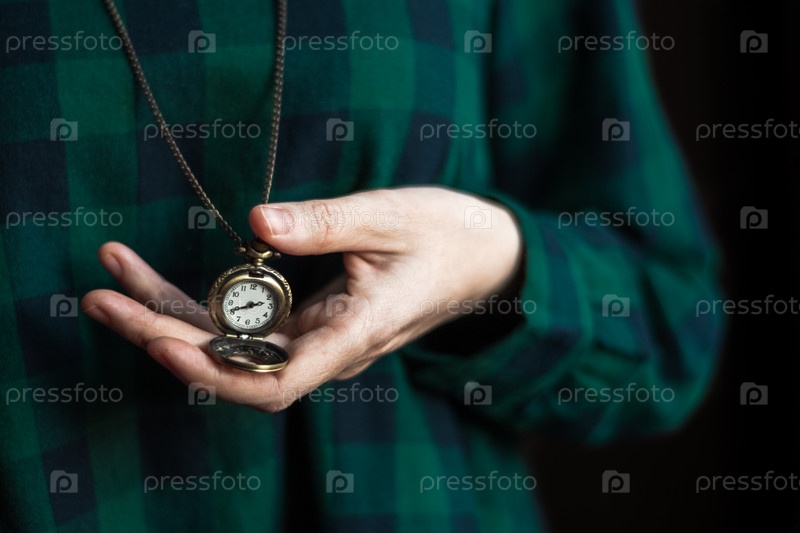 Старинные карманные часы на цепочке в руке на зеленом фоне