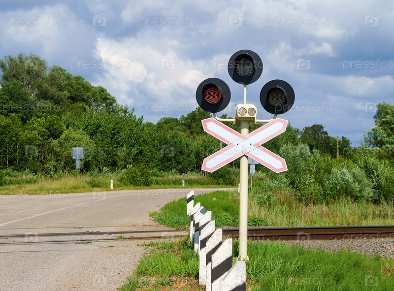 Красный светофор на железнодорожном переезде. Предупреждающий знак перед железнодорожным переездом. Вниманию автомобилистов