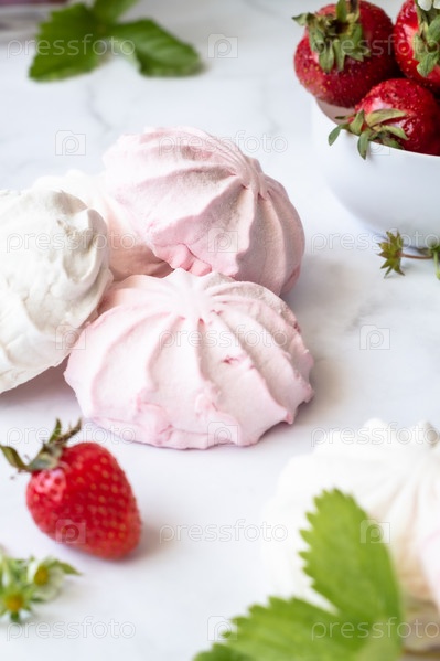 Красно-белый зефир на белом фоне рядом с миской клубники