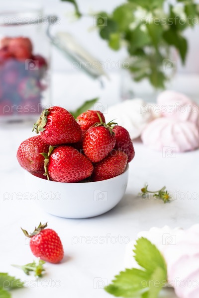 Спелая клубника крупным планом в белой чашке на белом фоне