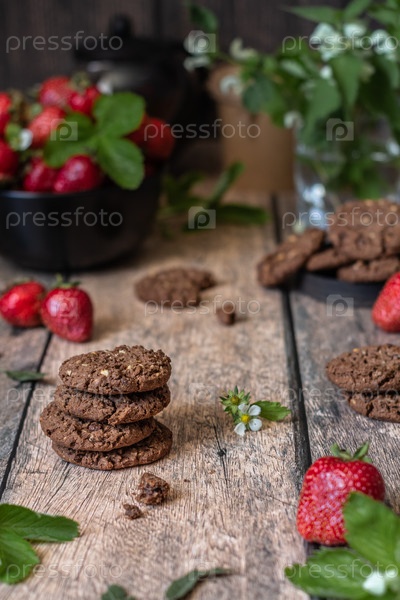 Шоколадное печенье и спелая клубника на деревянном столе