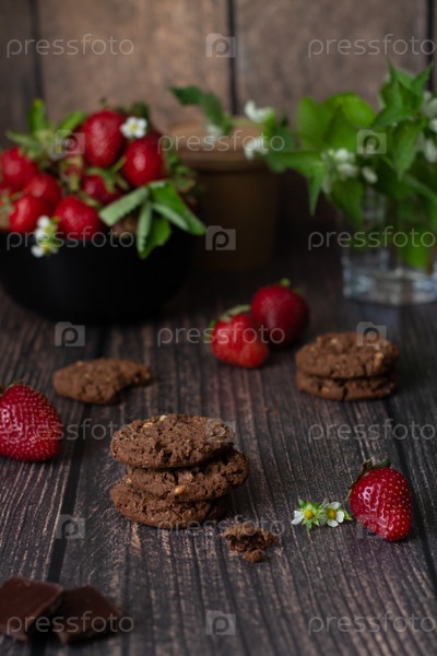 Шоколадное печенье и спелая клубника на деревянном столе
