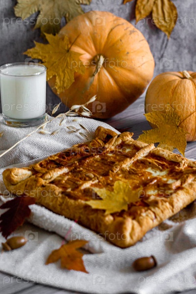 Вертикальное фото выпечки тыквенного пирога на День Благодарения, натюрморт осенней еды