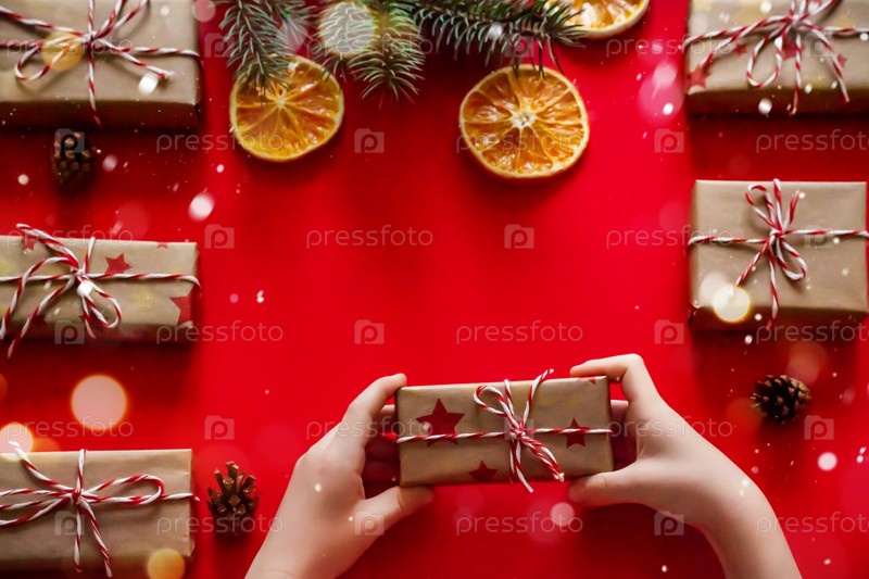 Детские руки держат рождественскую или новогоднюю подарочную коробку на красном фоне с копией пространства