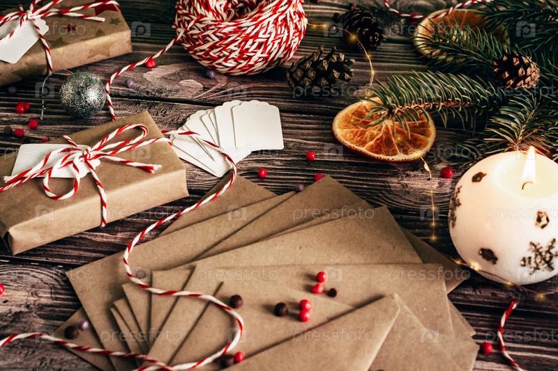 Поздравительная открытка с рождественскими подарками и рождественским декором крупным планом на темном деревянном фоне