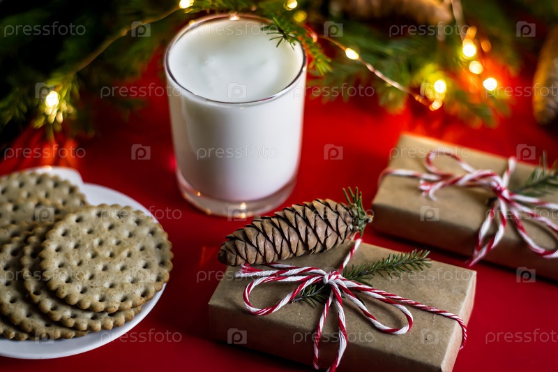 Рождественская открытка на красном фоне делает подарки, молоко и печенье для Санта-Клауса крупным планом