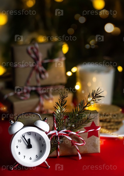 Часы с рождественской открыткой, показывающие без пяти минут до полуночи, подарки ручной работы, темный фон, вертикальное фото