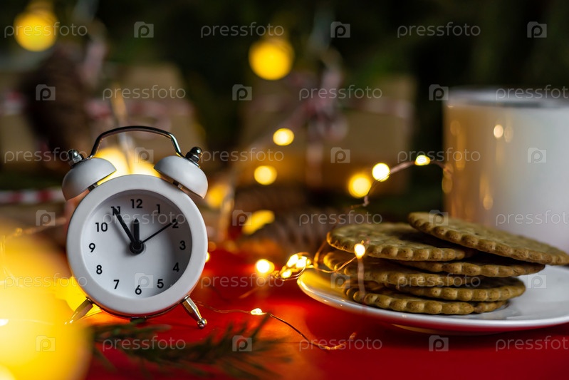 Будильник в сочельник показывает время от пяти минут до полуночи, печенье и молоко в стакане для Санта-Клауса, темный фон, боке