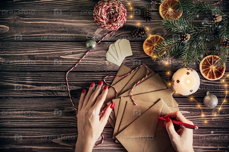 Плоская планировка готовится к рождеству женский почерк конверты для подарков на темном деревянном фоне с местом для вашего текста
