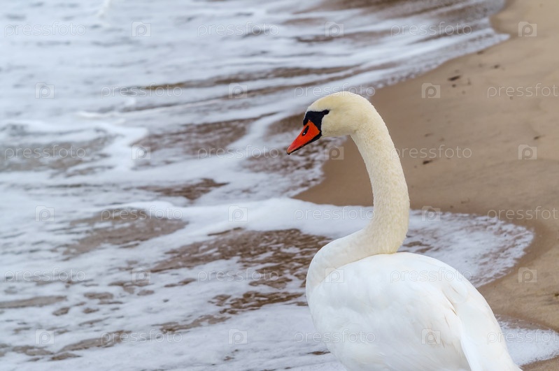 Лебедь на море. Белая птица на фоне песка. Белый лебедь