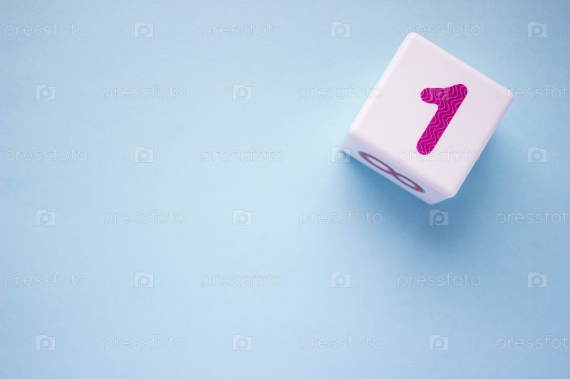 Фотография крупным планом белого пластикового куба с фиолетовой цифрой 1 на синем фоне в правом верхнем углу. С копией пространства