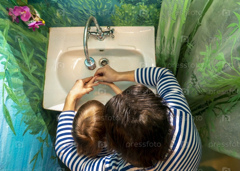 Мужчина и мальчик в тельняшках моют руки