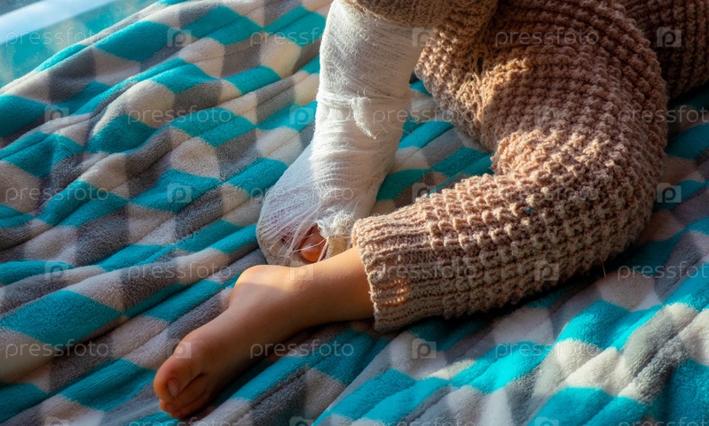 Ребенок с повязкой на переломе пятки ноги. Сломана правая ступня, шина малыша. Маленький мальчик спит на голубом одеяле