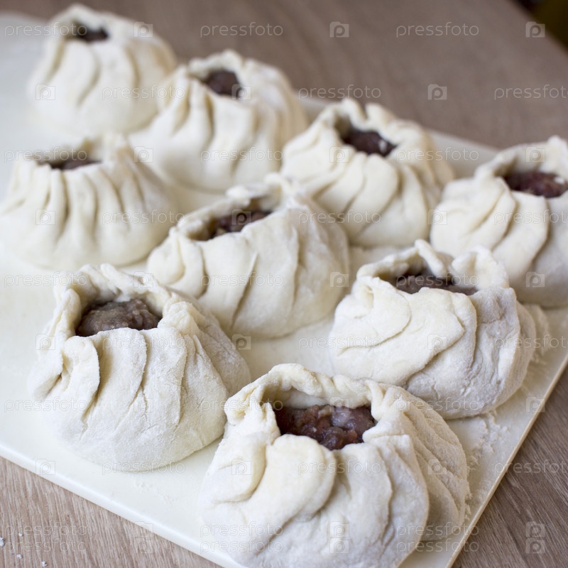 Процесс приготовления домашних пельменей. Сырые домашние пельмени на деревянной доске. Лепка пельменей