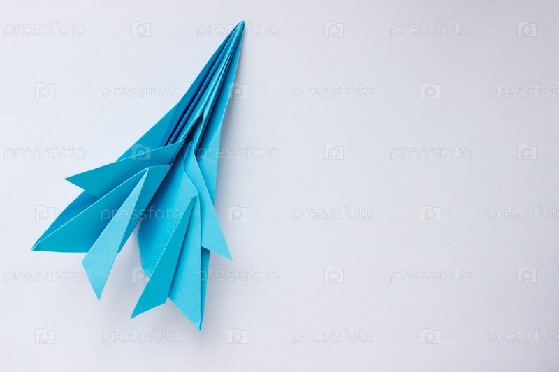 Самолет оригами из синей бумаги на белом фоне. Фон с местом для текста