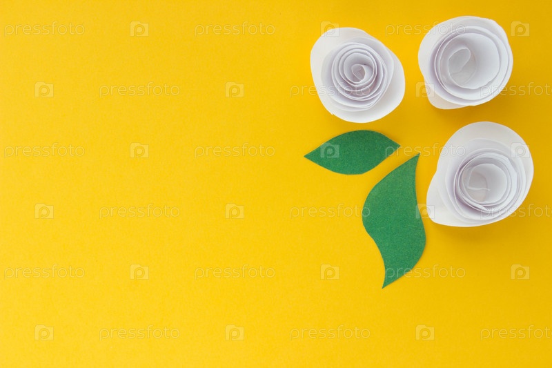 Баннер с белой розой оригами и бумажными листьями с местом для вашего дизайна на желтом фоне. Бумажный фон