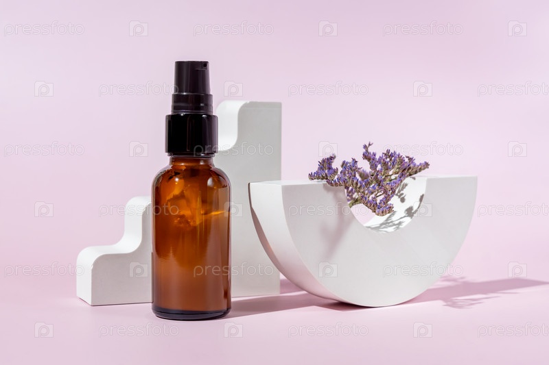 Натуральный продукт по уходу за кожей в стеклянной бутылке с дозатором. Жидкость или крем для женской кожи лица. Травяная минеральная косметика на белом бетонном стенде. Косметология в темной стеклянной упаковке. Минимализм