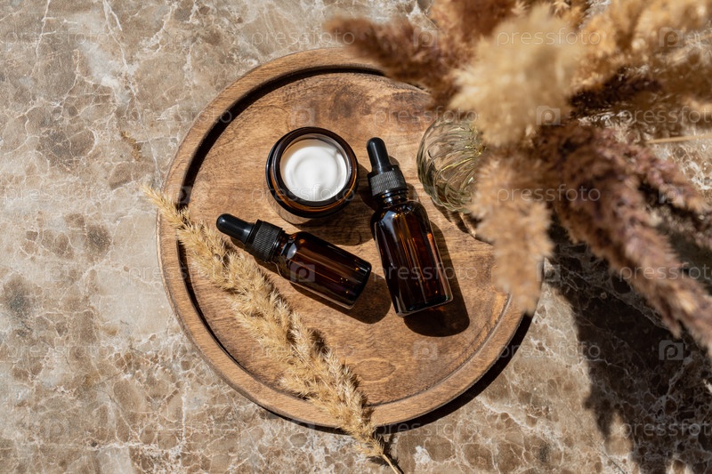 Антивозрастная коллагеновая сыворотка для лица в бутылке из темного стекла и крем для лица на деревянном круглом подносе с букетом сухой тростниковой травы. Натуральная органическая косметика