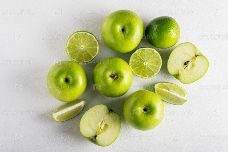 Свежие спелые зеленые яблоки и сочные лаймы на светлом фоне