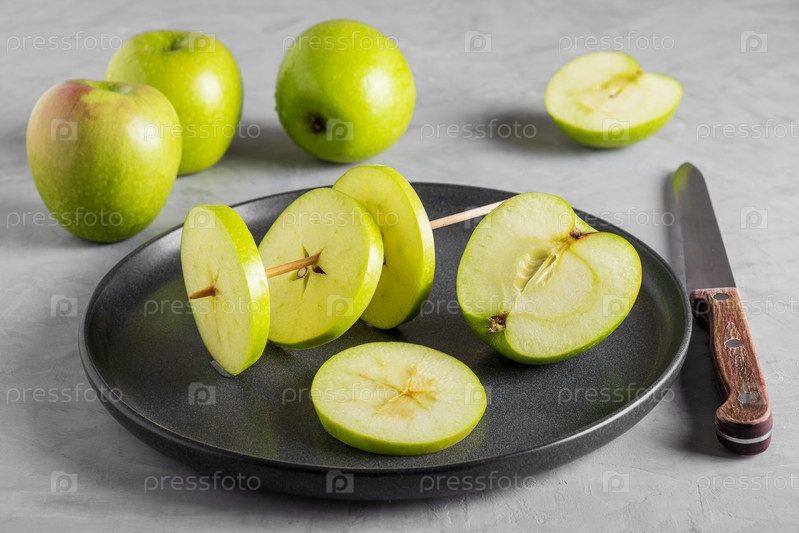 Целые и нарезанные яблоки на столе на черной тарелке. На деревянную шпажку нанизывают дольки яблок. Выборочный фокус
