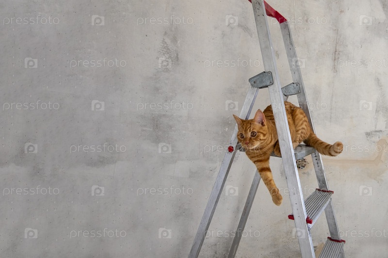 Молодой рыжий полосатый кот сидит на верхней ступеньке стремянки