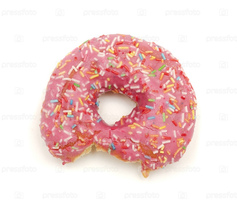 Укушенный розовый пончик на белом фоне