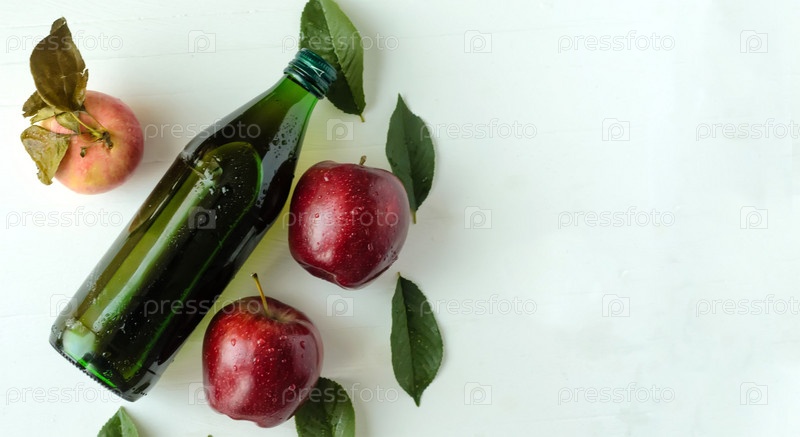 Бутылка яблочного уксуса с тремя свежими яблоками и зелеными листьями