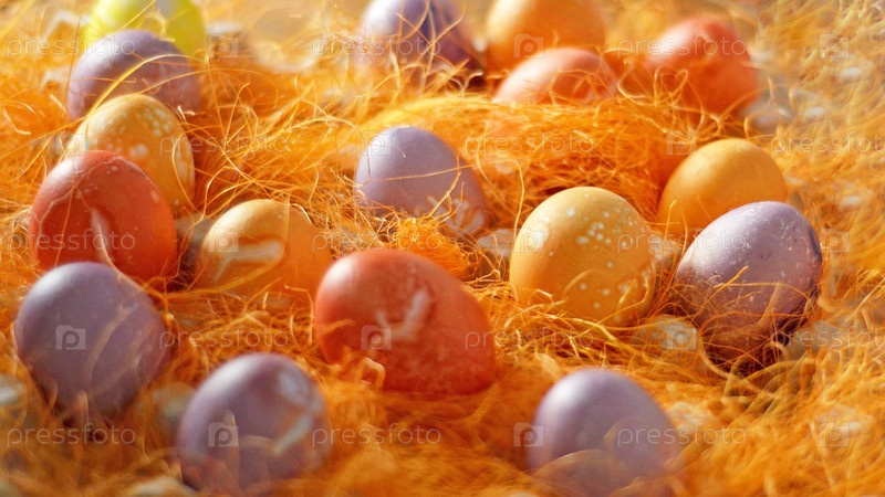Разноцветные расписные пасхальные яйца в декоративной сетке