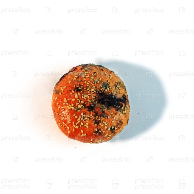Уродливая угольно-черная заплесневелая булочка для бургера на белом фоне