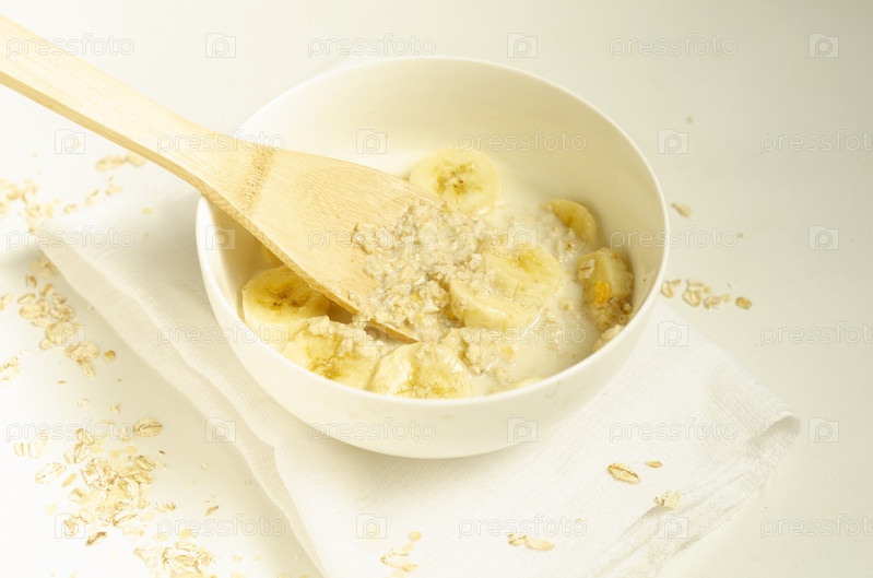 Овсяная каша с кусочками банана деревянной ложкой
